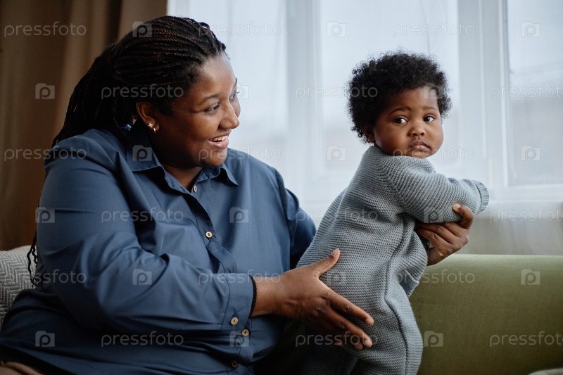 Счастливая чернокожая женщина держит в руках девочку-малышку, сидящую на диване
