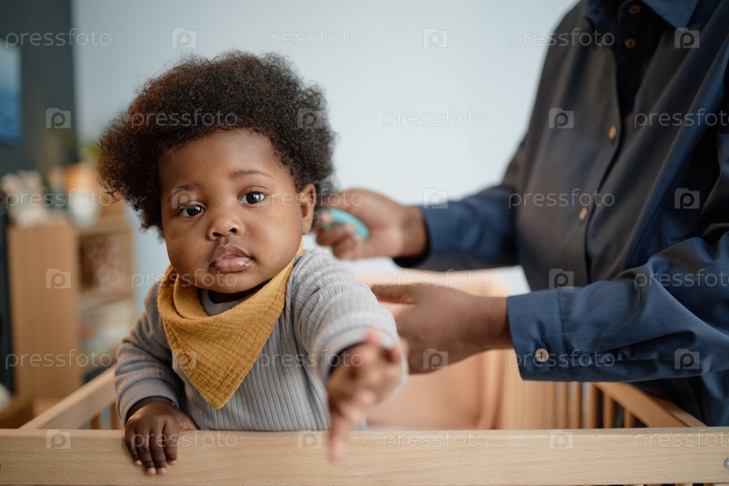 Мама чистит волосы любопытной черной девочки, стоящей в колыбели внутри дома