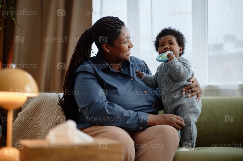 Улыбающаяся чернокожая женщина обнимает счастливого ребенка Девочка кусает зубы на диване