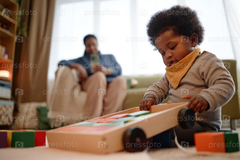 Черная девочка играет с строительными блоками, сидя на ковре в гостиной