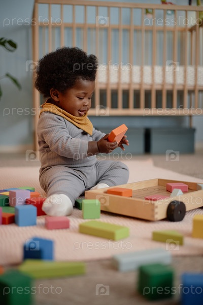 Милый черный маленький ребенок играет с строительными блоками на полу в спальне