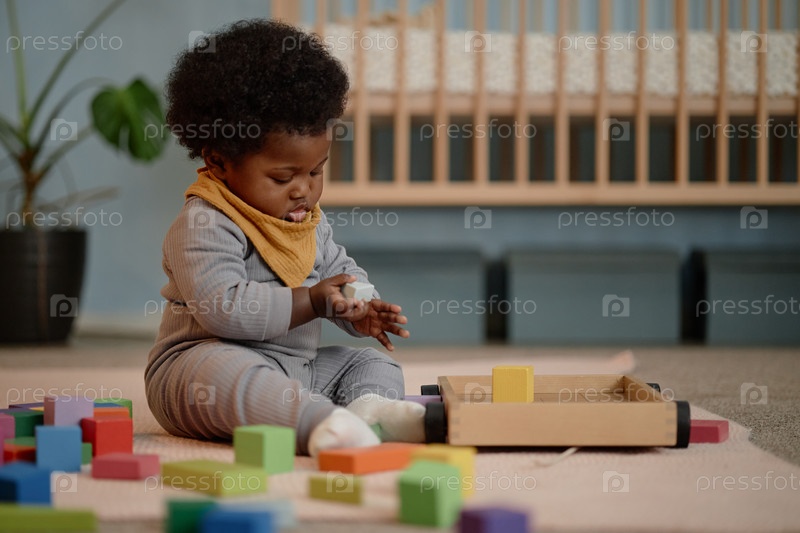 Сосредоточенный чернокожий ребенок играет в строительные блоки, сидя на полу дома