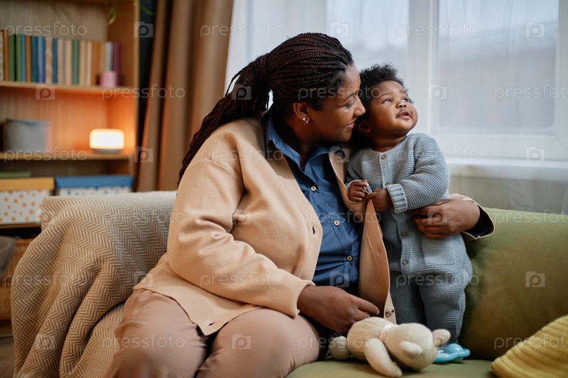 Счастливая чернокожая женщина в кардигане обнимает ребенка Девочка в рубашке на диване дома