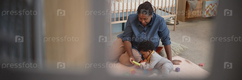 Header Image of Черная мать играет с ребенком на ковре в спальне