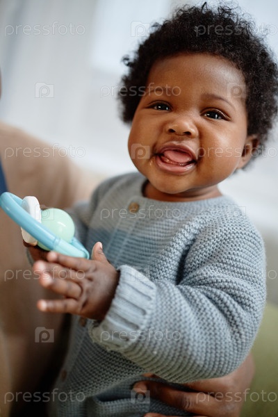 Портрет улыбающегося черного малыша, держащего зубную игрушку в помещении