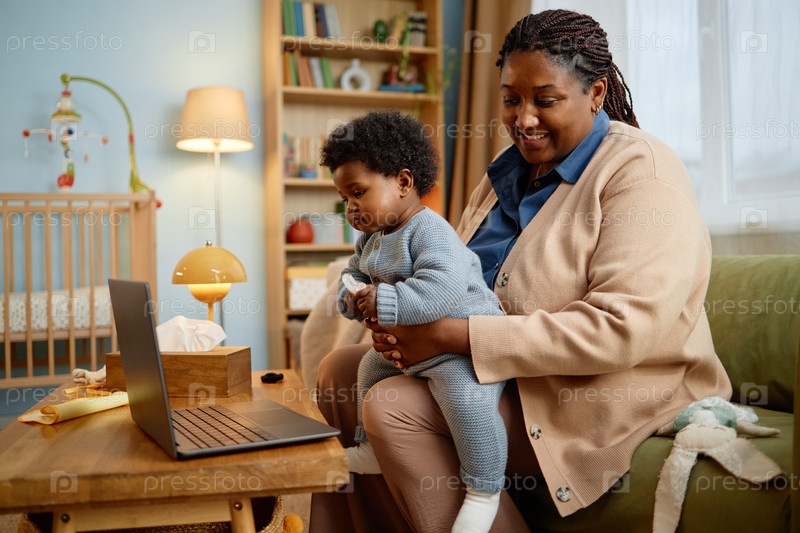 Счастливая чернокожая мать с девочкой на ноутбуке смотреть видео на компьютере дома