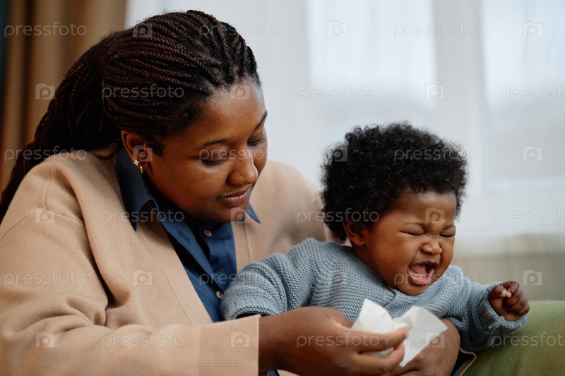 Заботливая чёрная мать утешающая плачущая девочка сидит на диване в помещении