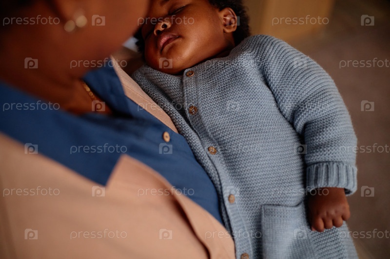 Черная девочка-ребенок в трикотажном ромпе спит на руках матери внутри