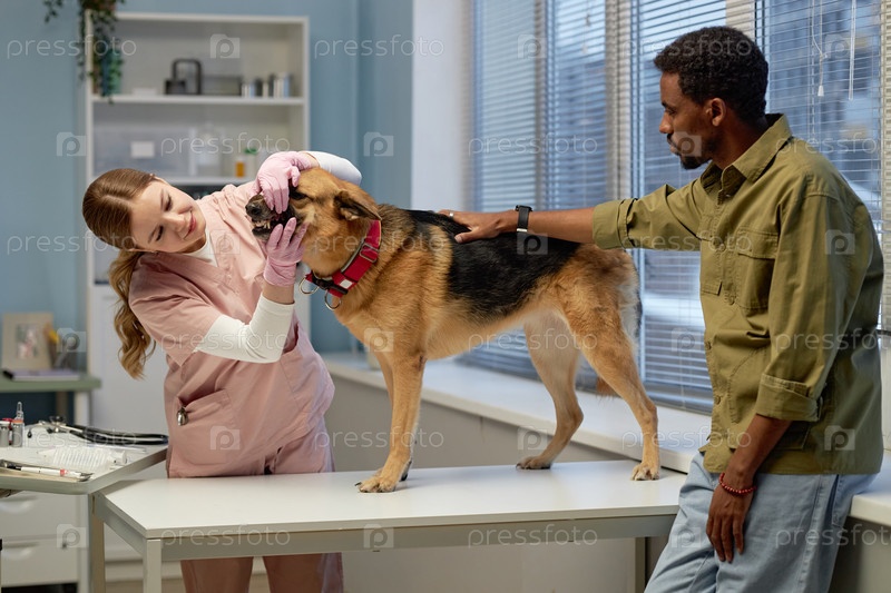 Ветеринарка, осматривающая зубы собаки смешанной породы на столе в клинике