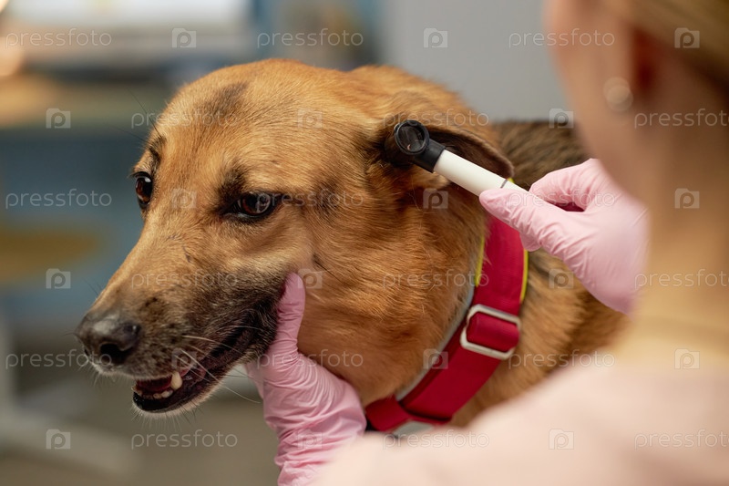 Врач, осматривающий ухо собаки смешанной породы с помощью отоскопа в клинике ветеринарии животных