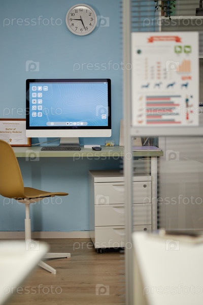 Офис ветеринарного врача с голубыми стенами, оснащенный настольным компьютером