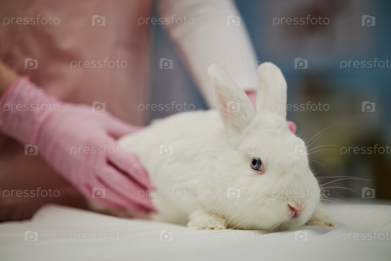 Белый кролик сидит на экзаменационном столе во время медицинского лечения в ветеринарной клинике
