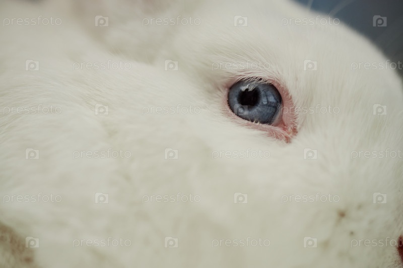 Голубой глаз домашнего кролика с белым мехом смотрит на камеру в помещении