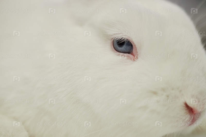 Спокойный домашний кролик с голубыми глазами и белым мехом смотрит на камеру в помещении