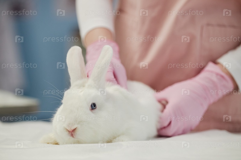 Домашний кролик сидит на экзаменационном столе во время медицинского лечения в ветеринарной больнице