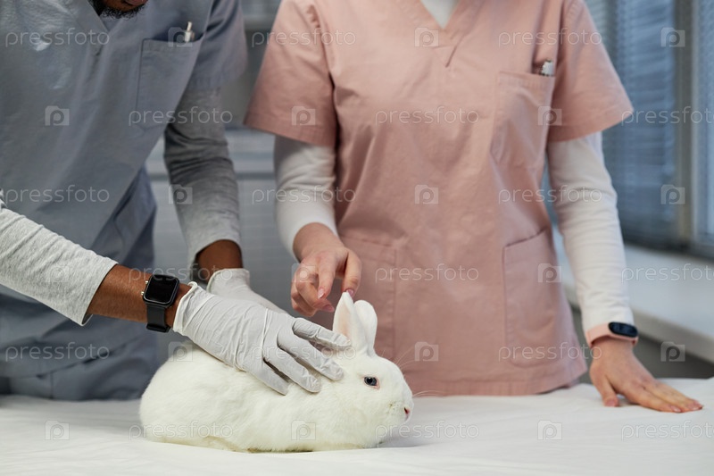 Черный ветеринар-врач проверяет шерсть кролика, а коллега помогает в клинике животных