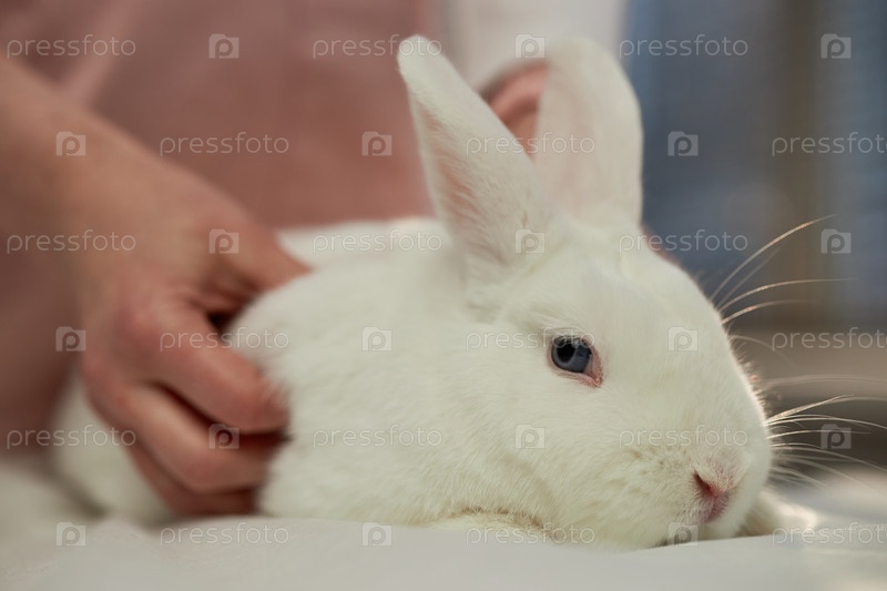 Белый пушистый кролик лежит на столе, в то время как ветеринар ласкает счастливого животного в клинике