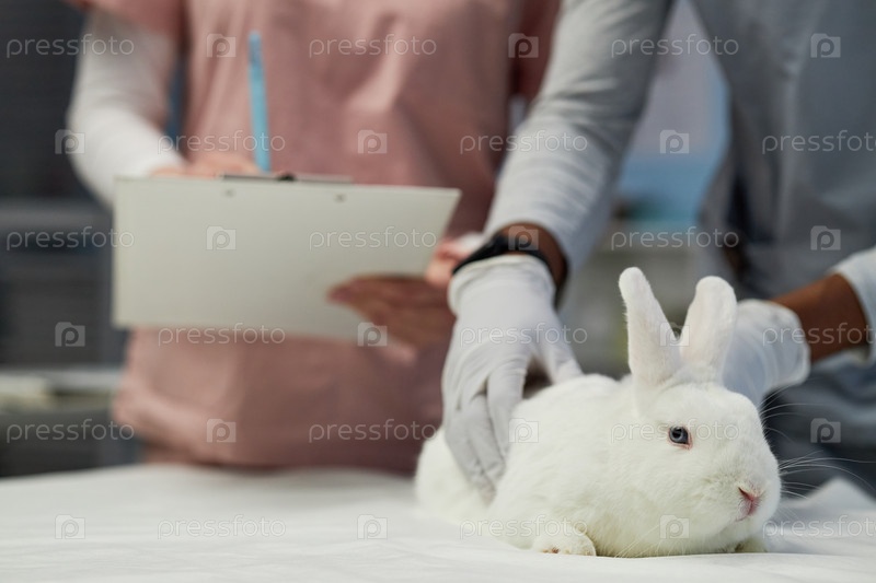 Два ветеринара, изучающих шерсть белого кролика сидят за столом в ветеринарной клинике