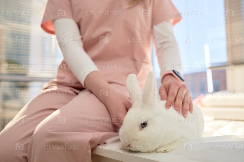Ветеринарная врач-женщина ласкает счастливого белого кролика, сидя за столом в клинике животных