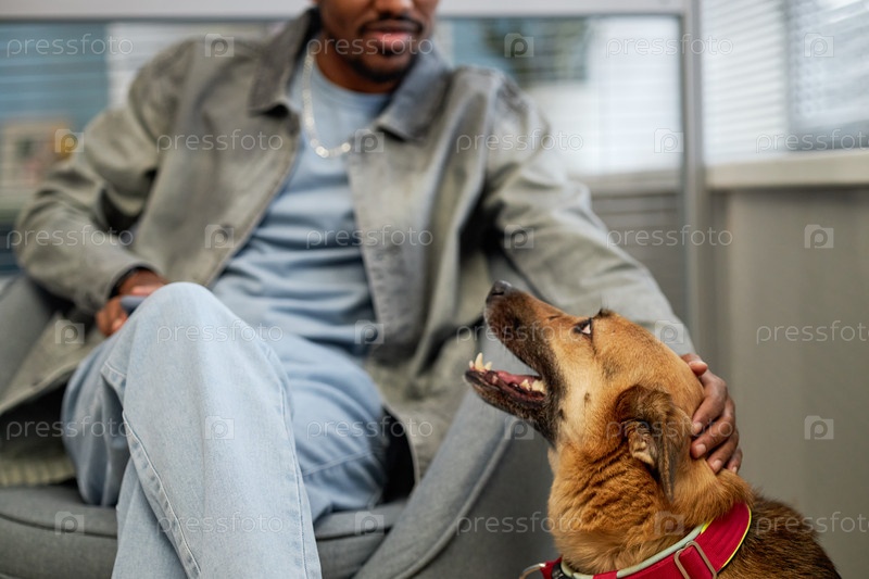 Черный мужчина ласкает счастливого собаку-монгрела, ожидая встречи в зале ветеринарной клиники