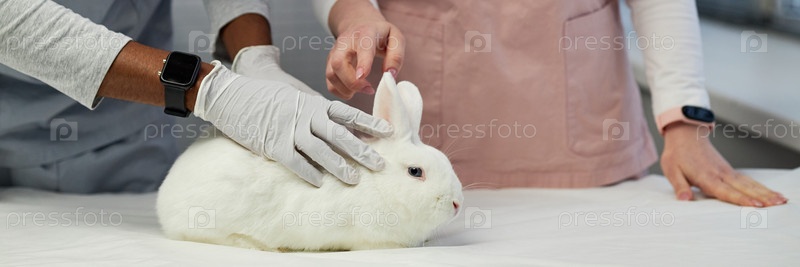 Header Image of Мужской ветеринар осматривает кролика, пока коллега помогает в клинике