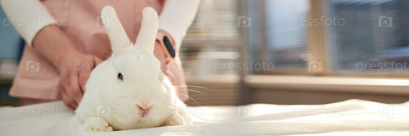 Header Image of Ветеринарный питомник Счастливый кролик, лежащий на столе в ветеринарной больнице