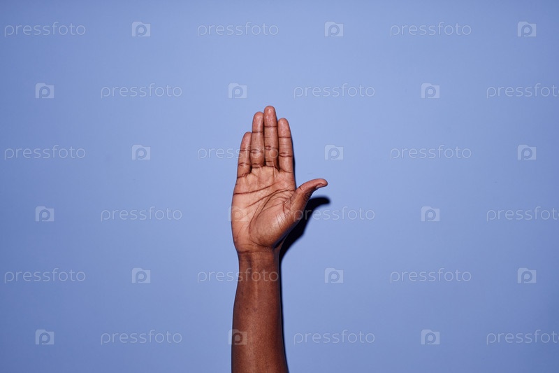 Жест поднятия руки, изолированный на фиолетовом фоне