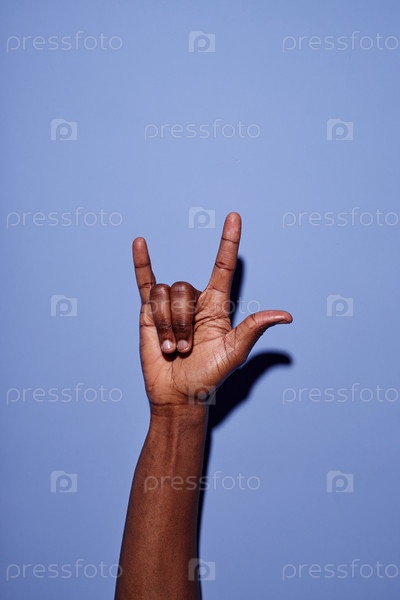 Рука, делающая рок-н-ролльный жест на синем фоне