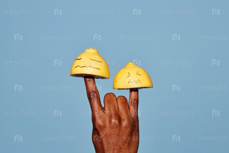 Рука держит лимонные половинки с рисунками на синем фоне