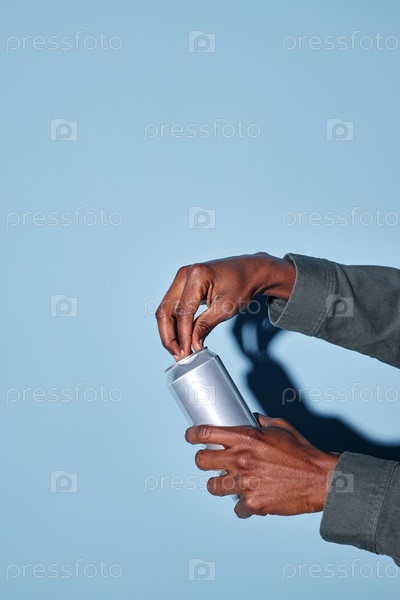 Держит открытую алюминиевую банку в правой руке на синем фоне