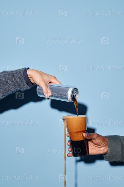 Налив кофе из банки в стеклянную чашку на синем фоне