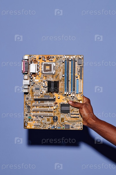 Держу материнскую плату компьютера на синем фоне