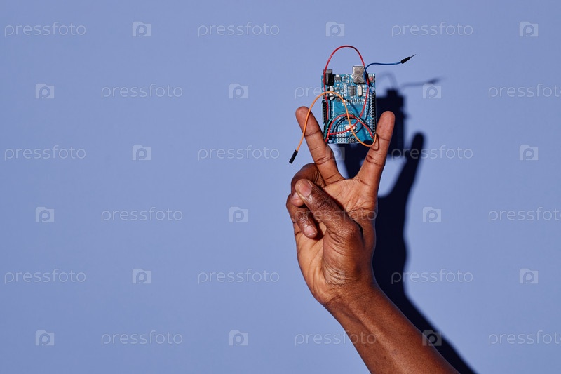 Удерживая электронную плату электрических схем на синем фоне