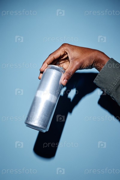 Рука держит металлическую банку на синем фоне