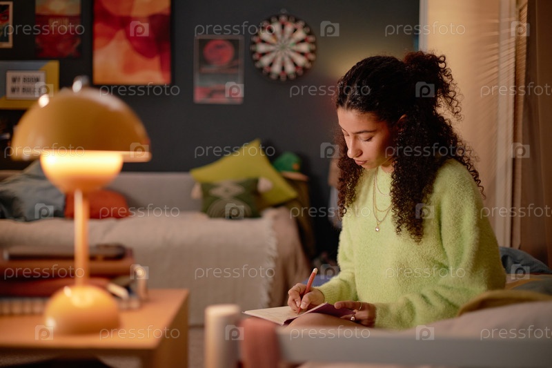 Молодая женщина учится в уютной комнате с теплым освещением