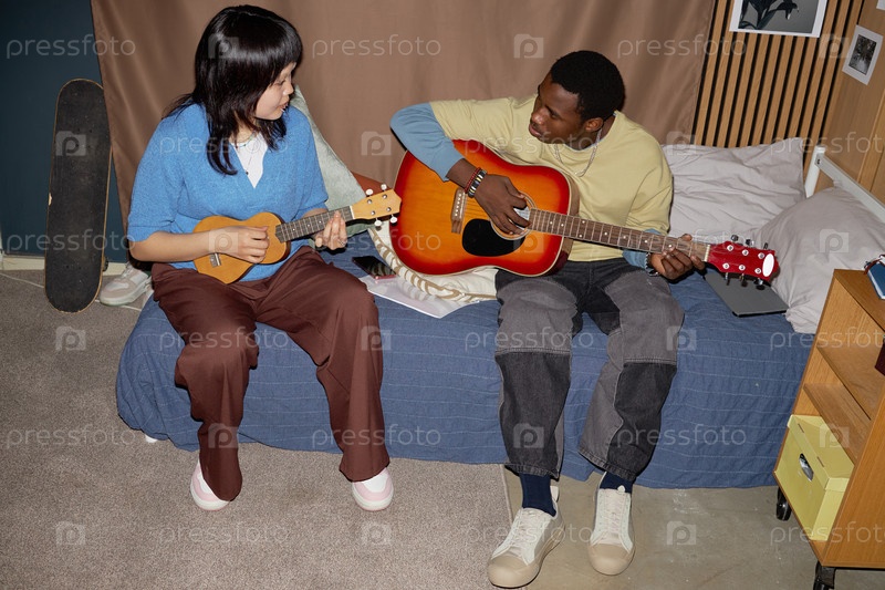 Играть на гитаре и укуле вместе в уютной спальне