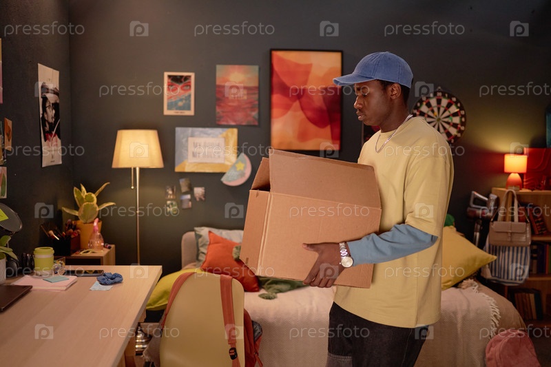 Человек, держащий коробки для переезда в стильной комнатной обстановке