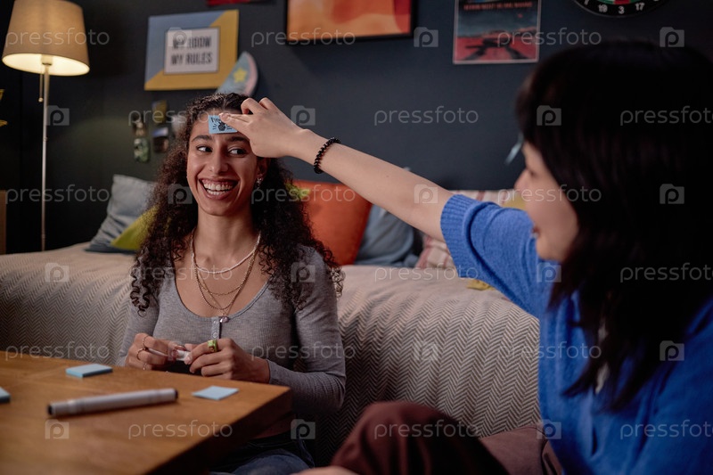 Улыбающиеся молодые женщины играют в карточную игру в гостиной