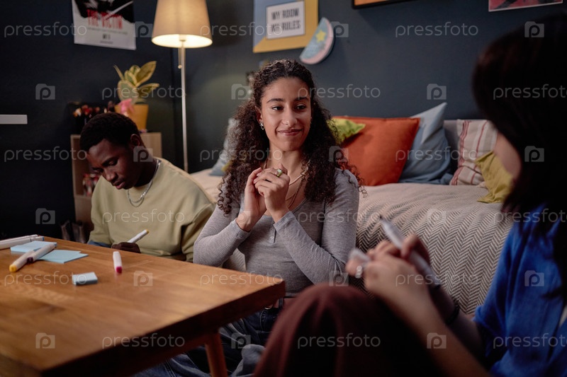 Улыбающаяся женщина разговаривает с друзьями в уютной гостиной