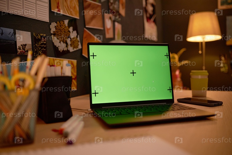 Ноутбук с зеленым экраном на рабочем столе в уютной рабочей зоне