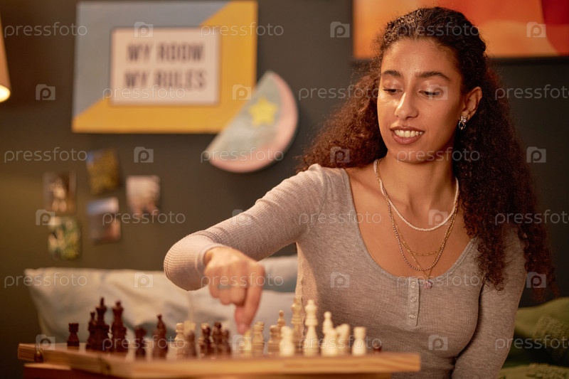 Портрет женщины, играющей в шахматы в уютной комнате