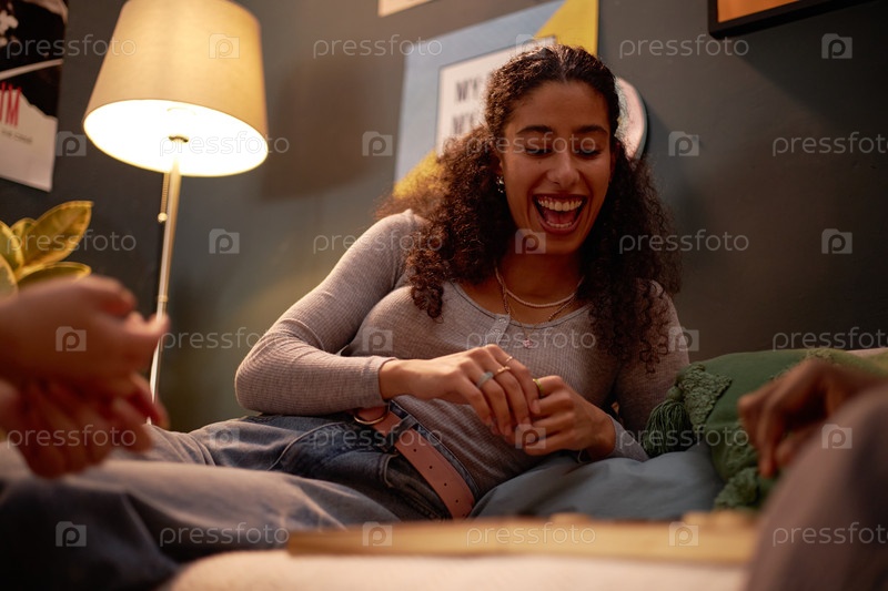 Улыбающаяся женщина играет в настольную игру с друзьями дома