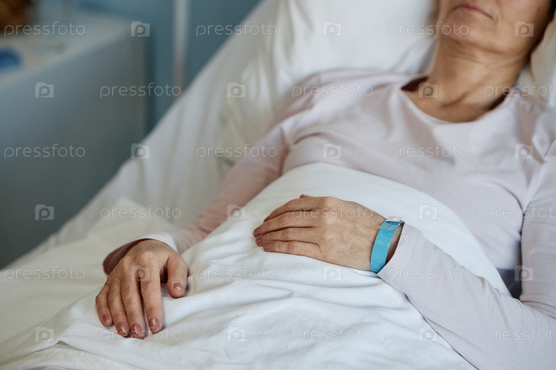 Пожилая женщина, отдыхающая в больничной кровати с медицинским браслетом