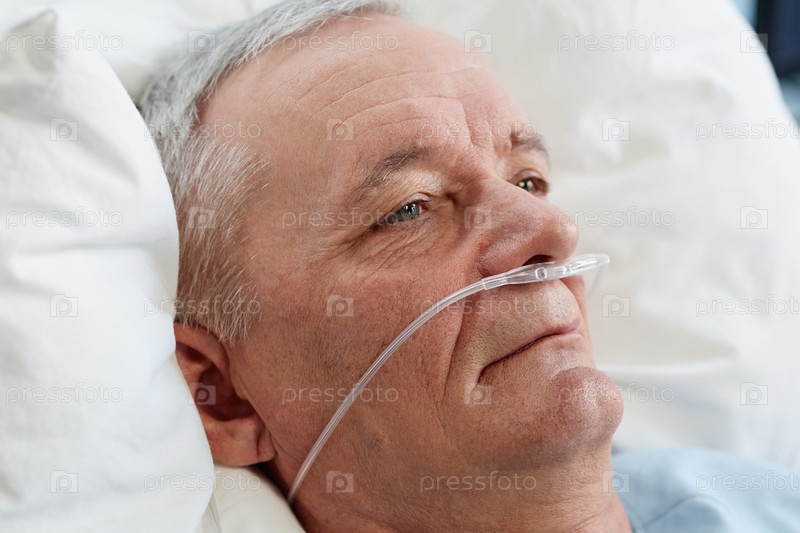 Пожилой мужчина отдыхает с носовой каннулой в больничной постели
