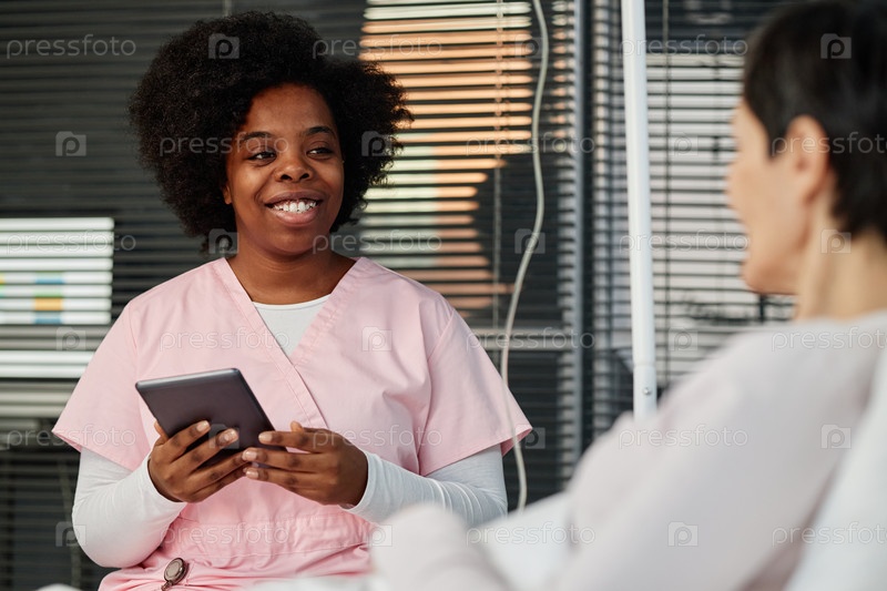 Улыбающаяся медсестра держит планшет в медицинской обстановке