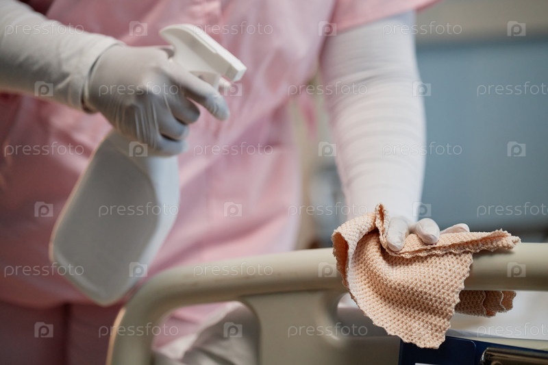 Уборка больничной кровати с помощью дезинфицирующего спрея и ткани