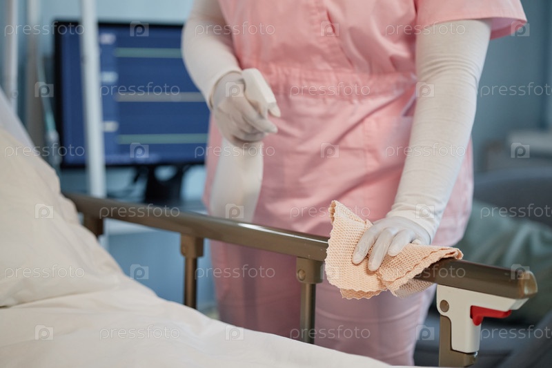 Уборка больничной кровати с дезинфицирующей тканью в медицинском учреждении