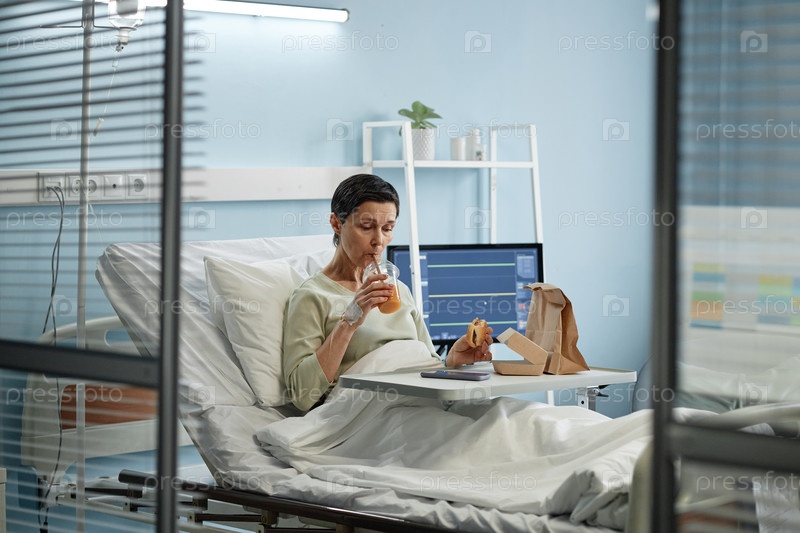 Восстанавливающийся пациент ест пищу в больничной комнате