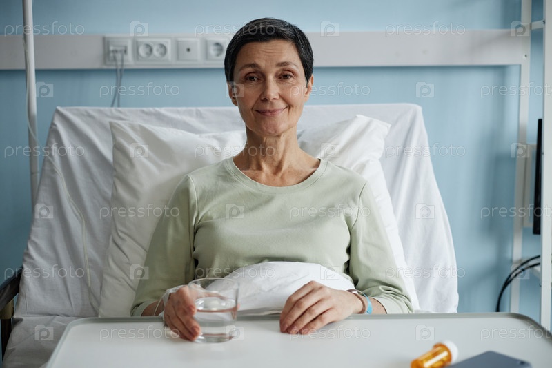 Портрет улыбающегося пациента, отдыхающего в больничной постели