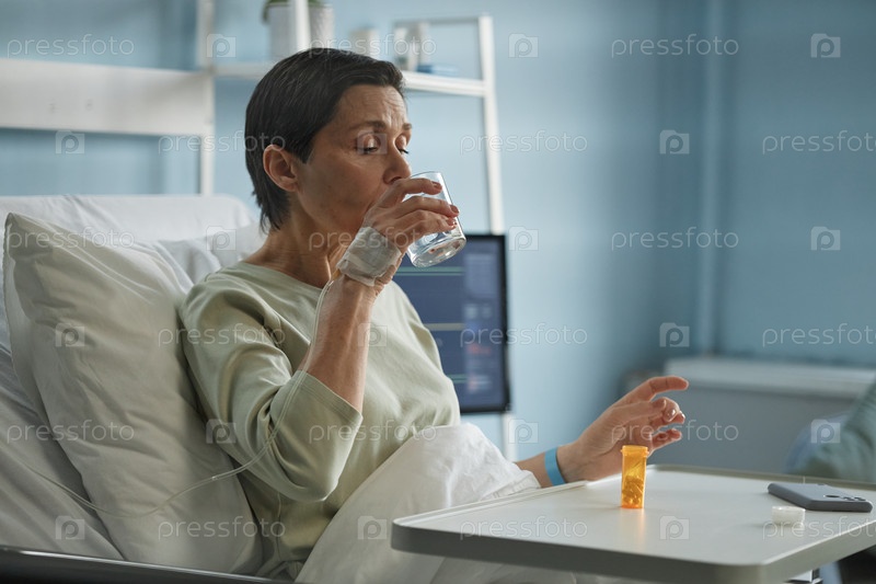 Пациентка-женщина пьет в больничной постели с внутривенным оборудованием